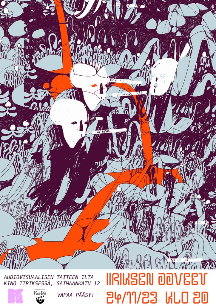 Audiovisuaaliseen taiteeseen keskittyvä Iiriksen AaVeet tapahtuu kolmannen kerran perjantaina 24.11.2023 klo 20 alkaen Lahden Kino Iiriksessä (Saimaankatu 12). Iiriksen AaVeet jatkavat yhden illan kestävänä avajaismaisena tapahtumana, jossa katsojille tarjotaan audiovisuaalista taidetta Iiriksen nostalgisessa elokuvasalissa.